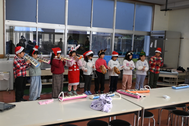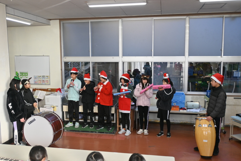 はじめに、全校児童が歌と楽器で「あわてんぼうのサンタクロース」を元気よく披露しました。